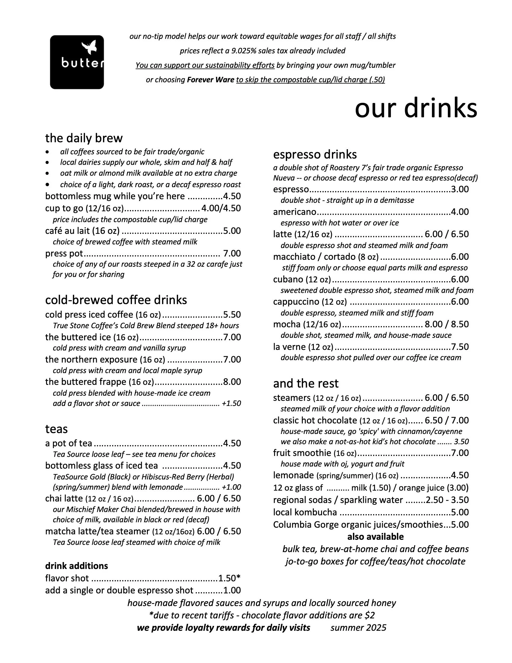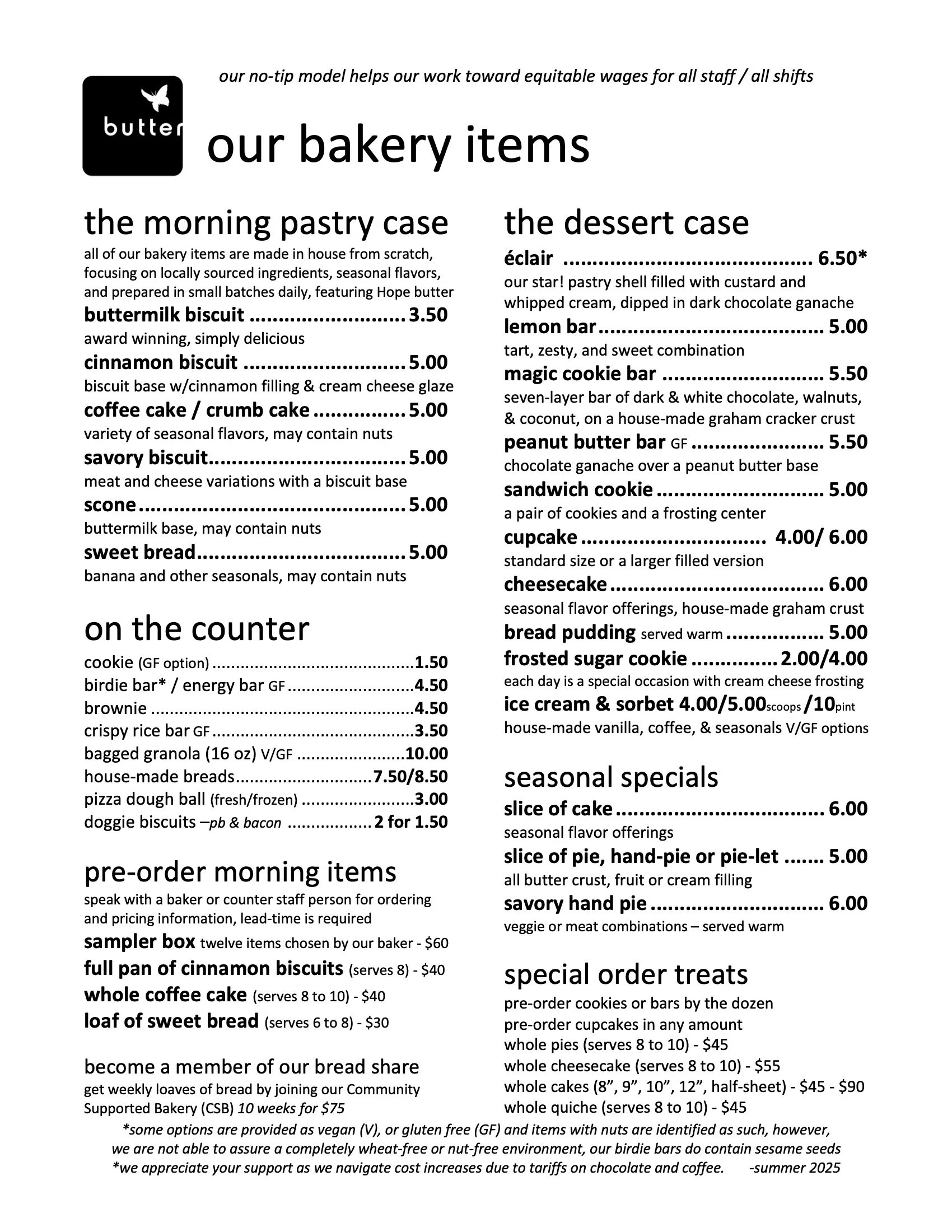 We moved to a no-tip pricing structure April 3, 2017. Our most recent 2025 menus reflect our current food ingredient costs and help us maintain our goal of having all of our staff begin at $16.75/hr as a base wage or above. Thanks for supporting our staff and all of the great local producers we work with! Our Latest Updates to these menus: April 1, 2025